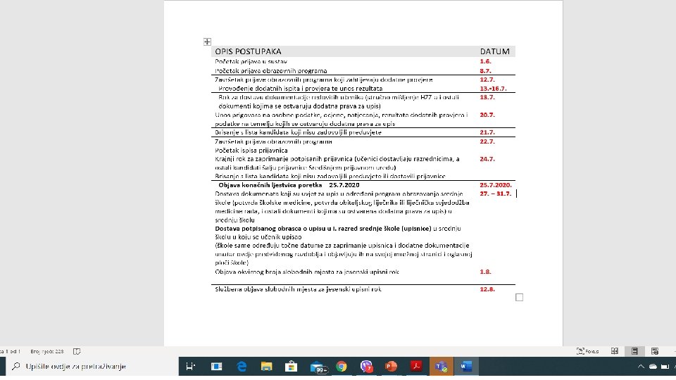 PAZITE! • Kandidati koji do roka navedenoga u Kalendaru za svaki pojedini upisni rok ne pribave i ne dostave valjani dokument, bez obzira na to što se na ljestvici poretka nalaze unutar upisne kvote, neće se moći upisati. • Ako se to dogodi na ljetnome upisnom roku, bit će upućeni da se na jesenskome upisnome roku natječu za programe obrazovanja u kojima je ostalo slobodnih mjesta.