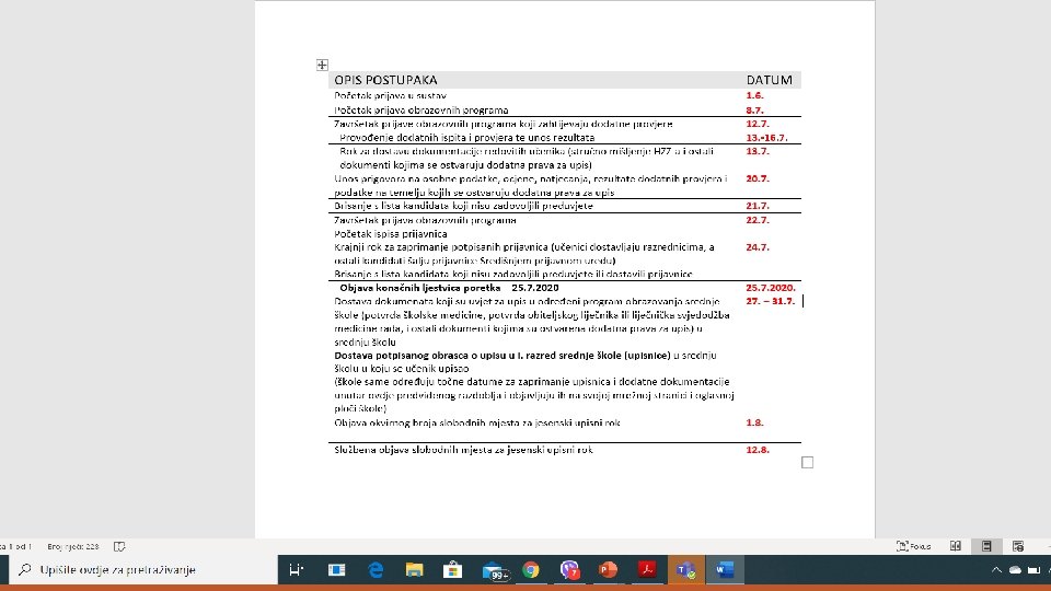 PAZITE! Kandidati koji do roka navedenoga u Kalendaru za svaki pojedini upisni rok ne pribave i ne dostave valjani dokument, bez obzira na to što se na ljestvici poretka nalaze unutar upisne kvote, neće se moći upisati. Ako se to dogodi na ljetnome upisnom roku, bit će upućeni da se na jesenskome upisnome roku natječu za programe obrazovanja u kojima je ostalo slobodnih mjesta.