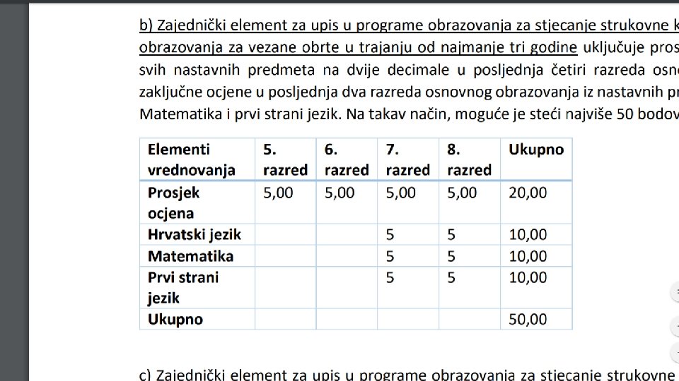 Programi obrazovanja za stjecanje strukovne kvalifikacije i programe obrazovanja za vezane obrte u trajanju od najmanje tri godine -prosjeke zaključnih ocjena svih nastavnih predmeta na dvije decimale u posljednja četiri razreda osnovnog obrazovanja Max 50 bodova -zaključne ocjene u posljednja dva razreda osnovnog obrazovanja iz nastavnih predmeta Hrvatski jezik, Matematika i prvi strani jezik.