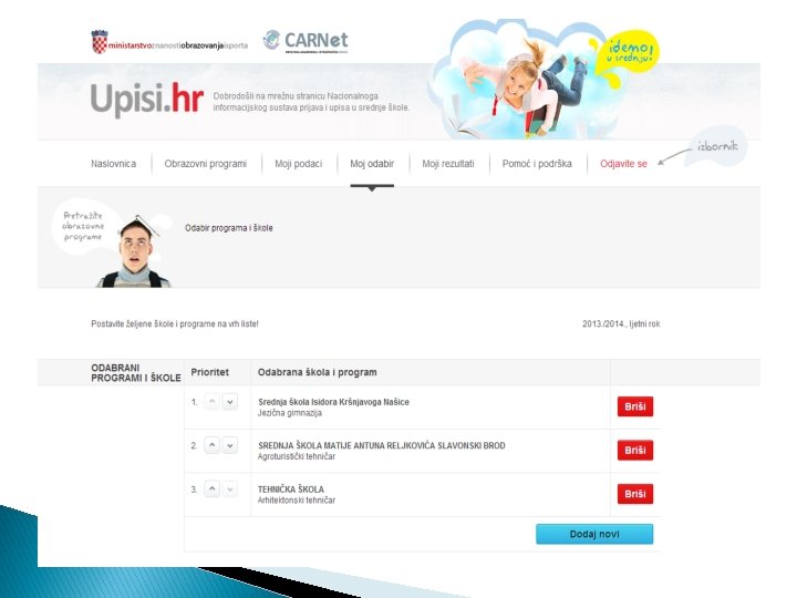 od 8. srpnja mogućnost odabira programa (škola i smjerova) Pregledati ponuđene programe (bodovni pragovi? , upisne kvote, podaci o potrebnim potvrdama, nepostojanju kontraindikacija…) Odabir maksimalno 6 programa u jednoj ili više škola prema redoslijedu želja – prioritetima Listu prioriteta moguće je mijenjati