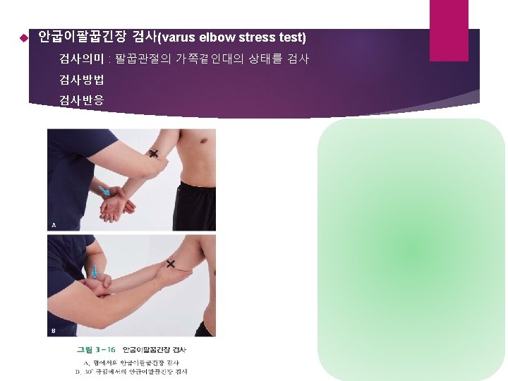Ligament & Motions that increase tension § Med. collateral lig. - ant. part: valgus, extension - post. part: valgus, flexion - transverse part § Lat. collateral lig. - radial collateral component : varus - ulnar collateral component : varus, flexion § Annular lig. : distraction of the radius