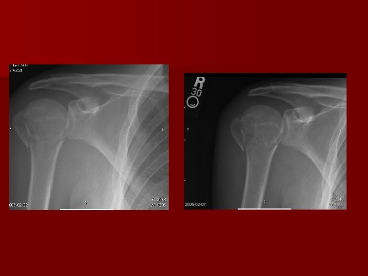 Shoulder Dislocations n Postreduction – Post reduction films are a must to confirm the position of the humeral head – Pain control – Immobilization for 7 -10 days then begin progressive ROM n Operative Indications – – Irreducible shoulder (soft tissue interposition) Displaced greater tuberosity fractures Glenoid rim fractures bigger than 5 mm Elective repair for younger patients