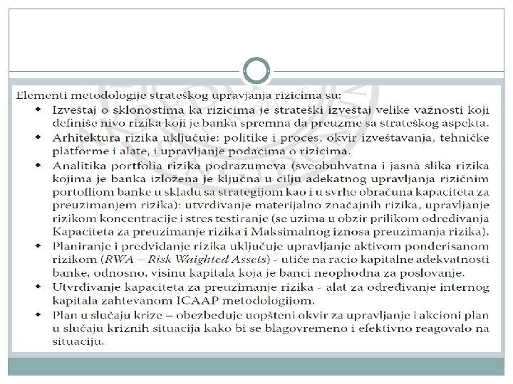 STRATEŠKI RIZIK – je mogućnost nastanka negativnih efekata na finansijski rezultat ili kapital banke usled nepostojanja odgovarajućih politika i strategija, te njihovog neadekvatnog sprovođenja, kao i usled promena u okruženju u kome banka posluje ili izostanka odgovarajućeg reagovanja banke na te promene.