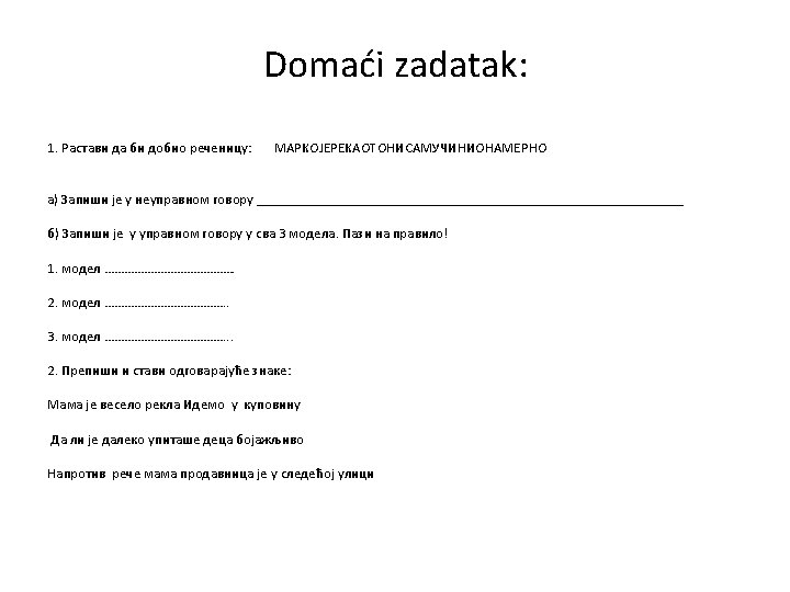 Neupravni govor 1. Prepiši rečenice: • Marko je rekao da će on obrisati tablu. • Jelena je rekla da ce ona otvoriti prozor. • Učiteljica se nasmešila i rekla kako je lepo kad ima vredne đake.
