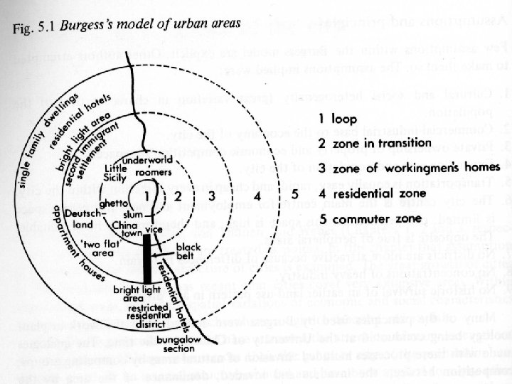 The basic conclusion • “the typical processes of the expansion of the city can best be illustrated, perhaps, by a series of concentric circles which may be numbered to designate both the successive zones of urban extension and the types of areas differentiated in the process of expansion” It is a model of urban growth