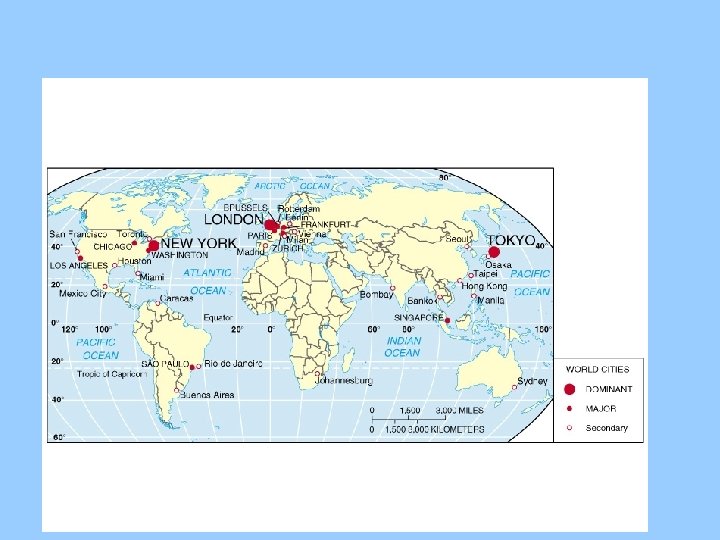 Place an X on each city as it is named on the following 12 lists. Each list identifies the top 5 cities as ranked according to its provision of certain services (Taylor 2005). As cities are named more than once, just keep adding more X’s. Banking $ London New York Tokyo Hong Kong Singapore