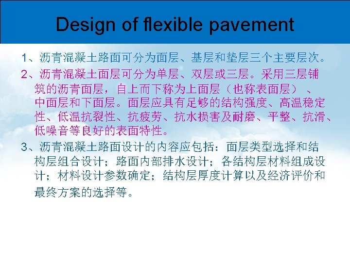 Maitenence • Flexible pavements generally require some sort of maintenance or rehabilitation every 10 to 15 years. • Rigid pavements, on the other hand, can often serve 20 to 40 years with little or no maintenance or rehabilitation.