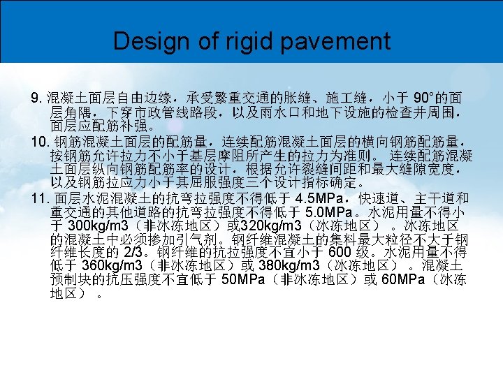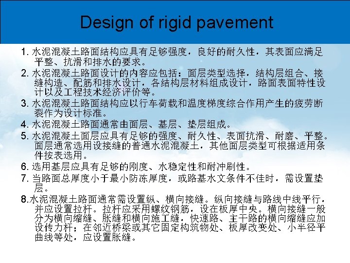 Advantages of Rigid Pavement • Good durability • Long service life • Withstand repeated flooding and subsurface water without deterioration