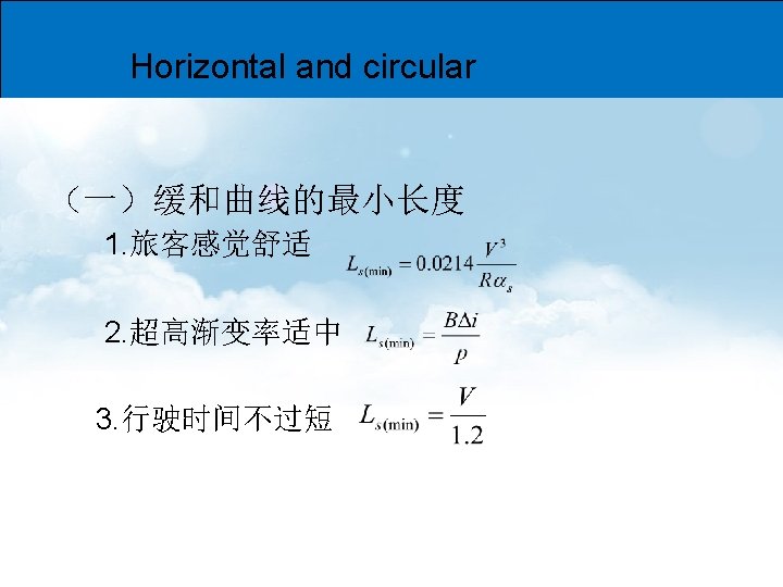 Vertical grade and length of vertical slope Minimum length of the vertical slope 1. Restraint the centrifugal force (限制离心力) 一般情况下,单位车重的离心力(F/G)控制在 0. 020~ 0. 03之间, 则最小竖曲线长度 为: 2. Restraint the running time (限制行程时间过程) 3. Meet the requirement of sight distance (满足视距要求 ) 返回 上一页 下一页 退出