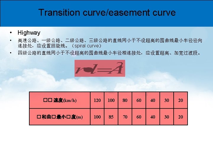 Vertical grade and length of vertical slope • Highway • Urban road • 表 6. 3. 2 最大纵坡 100 80 60 50 40 30 20 最大纵坡推荐值 (%) 3 4 5 5. 5 6 7 8 最大纵坡限制值 (%) 4 5 设计速度(km/h) 6 8 9