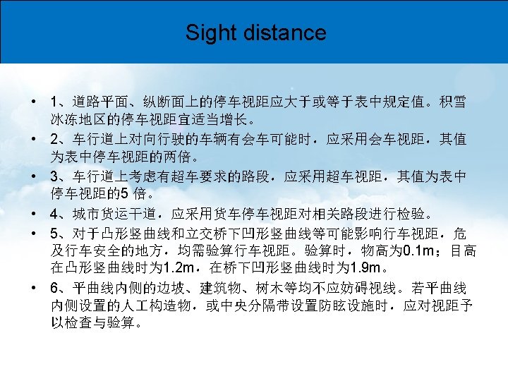 Sight distance • Stopping sight distance(停车视距) S停=S 1+S 2+ (m) • 会车视距 (m)