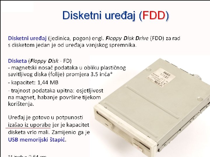 Magnetski disk Princip rada: • Disk se okreće oko svojeg središta a iznad njega je magnetska glava. • Podaci su zapisani kao niz magnetiziranih čestica smještenih na koncentričnim krugovima u magnetskom sloju diska. • Prilikom čitanja podataka magnetizirane čestice prolaze ispod glave i u njoj induciraju električnu struju, čiji smjer ovisi o orijentaciji magnetskih čestica pa se ovisno o tome mogu razlikovati logičke “ 0” i “ 1”.