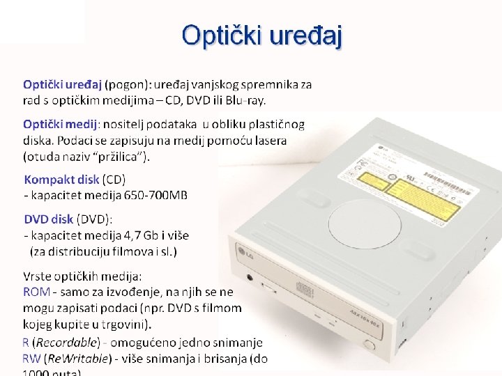 Optički disk • Kao izvor svijetla pri upisu i čitanju podataka koristi se laser, jer ima mogučnost stvaranja vrlo uskog snopa svjetlosti. • Upisivanje podataka vrši se "paljenjem" površine plastičnog medija pomoću laserske zrake, čime se ostvaruje efekt udubljenja. • Kod čitanja se rabi svojstvo odbijanja ili refleksije laserske zrake od površine pri čemu se različiti faktori odbijanja svijetla tumače kao različite informacije logičkih “ 0” i “ 1”