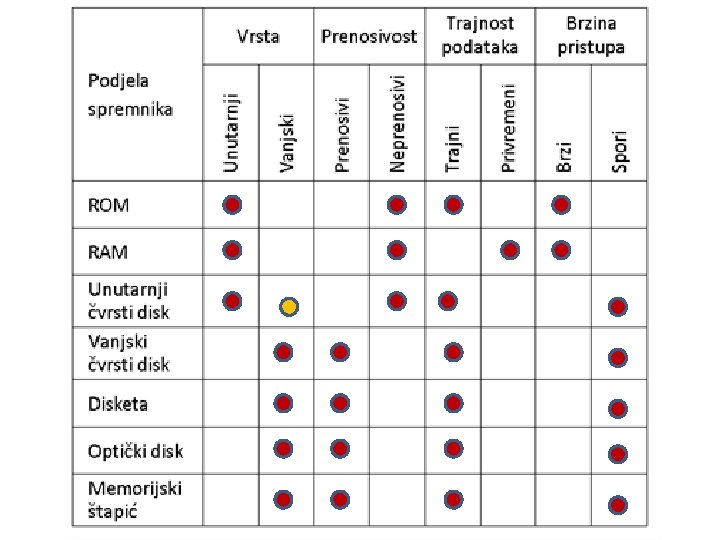 Podjela memorijskih spremnika prema: • trajnosti zapisa podataka – privremeni – RAM memorija – trajni – ROM, tvrdi disk, CD, DVD, BD, USB flash disk, SSD, memorijska kartica) • tehnologiji zapisa podataka – magnetski (HDD, disketa, mag. vrpca, mag. kartica) – optički (CD, DVD, BD ) – poluvodički (USB, SSD, Memorijska kartica) • mjestu i funkciji – unutarnji i vanjski • Prenosivosti – prenosivi – neprenosivi • Brzini pristupa – spori – brzi 4