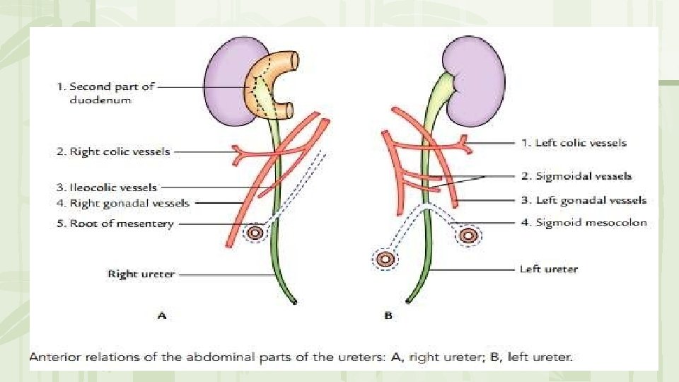 RELATIONS OF ABDOMINAL PART Medially the right ureter is related to inferior vena cava and left ureter is related to left gonadal vein and inferior mesenteric vein.