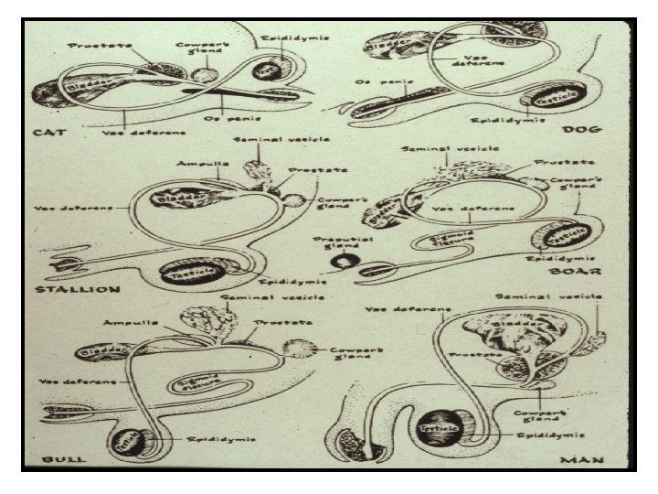 • The length and diameter of the urethra varies considerably between the domestic mammals. • Horse : short and wide and comparatively long in the dog were it opens on a small elevation flanked by two grooves. • Cow and sow : urethralis muscle encloses the suburethral diverticulum which opens together with the urethra into the vagina. Ureteral orifice Urethral crest Urethral m. Suburethral diverticulum External urethral orifices
