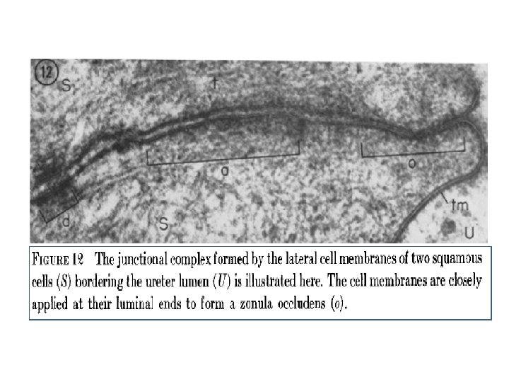 • There are junctional complexes, comprising a zonula occludens, zonula adherens , and macula adhaerens or desmosome, between the lateral borders of the squamous cells . It is suggested that this complex is t h e major obstacle to the free flow of water from the extracellular spaces into the hypertonic urine ( in lumen of ureter )