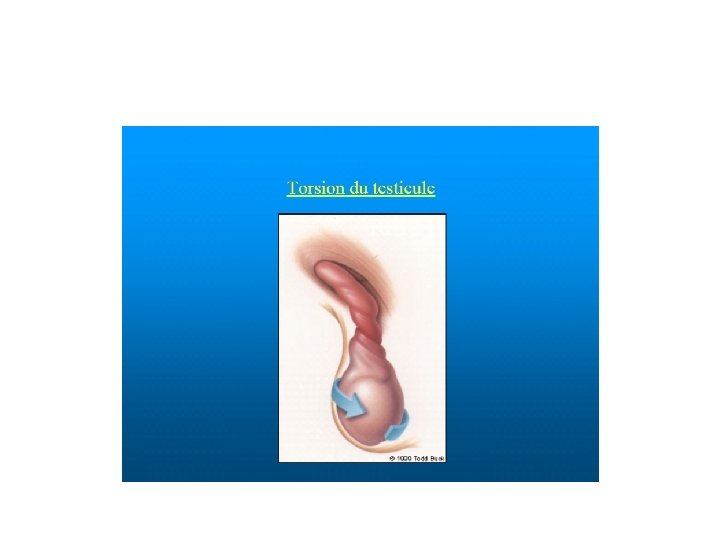 Traitement • Chirurgie en urgence dans les 6 h sans examen complémentaire • Détorsion du testicule • Fixation des testicules homo et controlatéraux (préventive) • Si nécrose testiculaire : orchidectomie • Surveillance : possible atrophie IIaire