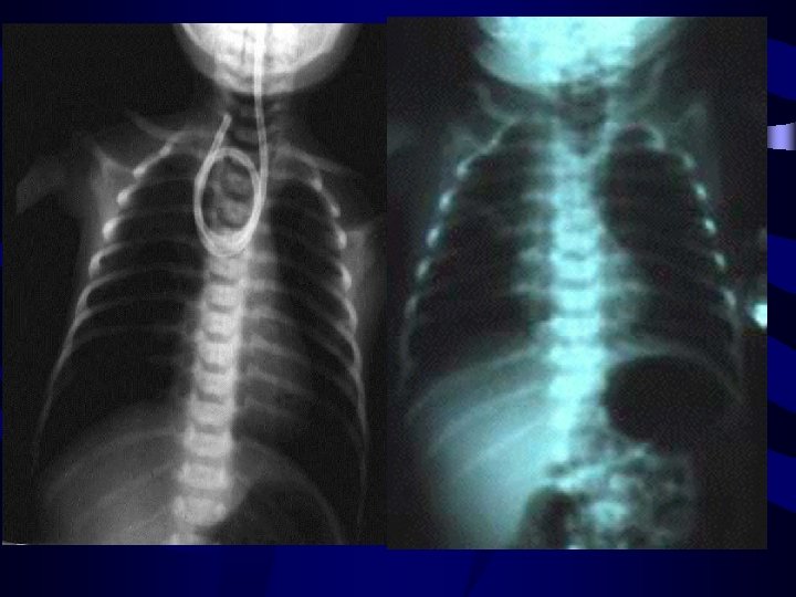 DIAGNOSTIC POST NATAL • stase salivaire parait dés la naissance, s’accompagne d’une certaine cyanose qui ne cède pas aux essais de désobstruction mousse aux lévres. • Très vite des petites crises de toux et de cyanose vu l’impossibilité de déglutir sa salive. • butée de la sonde gastrique 8 -10 cm de l’arcade dentaire test à la seringue avec 5 cc d’air
