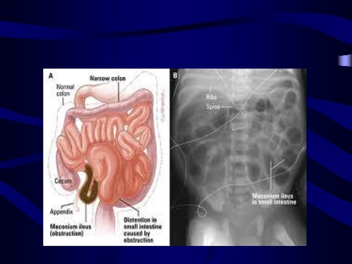 • 6 -iléus méconial: C’est l’obstruction de la lumière de l’iléon terminal par du méconium durci et anormal. L’étiologie la plus fréquente la mucoviscidose (98%). L’iléus méconial peut être reconnu lors d’un diagnostic prénatal par l’association d’un grêle hyperéchogène et d’une distension. Le pronostic global dépend en fait de l’évolution de la maladie causale.