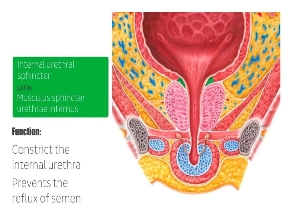 INTERNAL URETHRAL SPHINCTER ▸ It is comprised of smooth muscle that is located at the junction of urethra and the urinary bladder. ▸ It is innervated by S 2 -S 4 nerves of the pelvic plexus. ▸ It's function is to constrict the internal urethra , preventing the urine leakage and also prevents the Retrograde ejaculation ( Ejaculatory Reflex ) of semen into the bladder.
