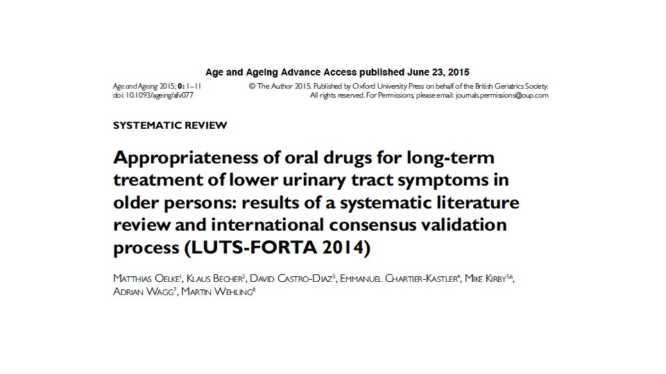 LUTS FORTA Classification: OAB drugs Class A (absolutely) Indispensable drug, clear‐cut benefit in terms of efficacy/ safety ratio proven in elderly patients for a given indication Class B (beneficial) Drugs with proven or obvious efficacy in the elderly, but limited • extent of effect or safety concerns Fesoterodine Drugs with questionable efficacy/safety profiles in the elderly, to be avoided or omitted in the presence of too many drugs, lack of benefits or emerging side effects; review/find alternatives • • • Darifenacin Mirabegron Extended-release oxybutynin Solifenacin Tolterodine Trospium Class D (don’t) Avoid in the elderly, omit first, review/find alternatives • • Immediate release oxybutynin Propiverine Class C (careful) Oelke M et al. Age Aging 2015: 1 -11.