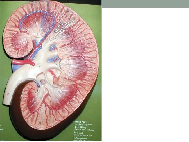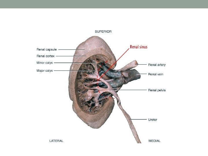 Kidney Anatomy (Coronal) • Renal Hilus – indention of kidney • Renal Cortex – outermost layer, granular • Renal Medulla – striated, composed of renal pyramids (kidney tubules here) • Renal Pyramids • Minor Calyx – receive urine from renal pyramids • Major Calyx – receive urine from minor calyces • Renal Pelvis – funnel shaped portion of ureter; receives urine from major calyces • Ureter
