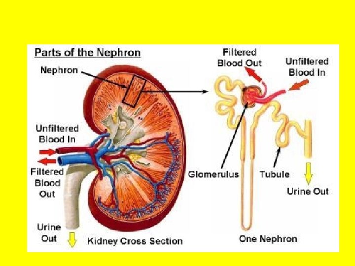Blood Flow to Kidneys • Blood from abdominal aorta to renal arteries – Blood filtered 1 st – Gas exchange 2 nd • Renal veins take deoxygenated blood from kidneys • Veins lead to inferior vena cava
