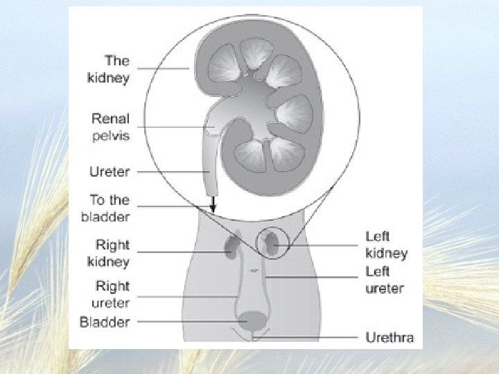 We got urine. . . now what? • The collecting ducts merge together and empty into a minor renal calyx which in return empties into a major calyx, which them empties into the renal pelvis, which empties into the ureter • The ureter is a tube that leads to the urinary bladder – Uses peristaltic waves to move the urine down its length