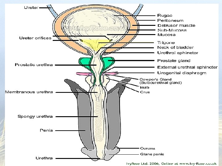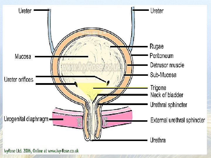We made it to the bladder • A hollow, distensible, muscular organ – Stores urine and then forces out the urethra – In the pelvic cavity, behind the symphysis pubis and under the parietal peritoneum – A sphincter at the neck of the bladder hold urine in until the pressure inside is to a certain level Involuntary control – External urethral sphincter – skeletal muscles – voluntary control