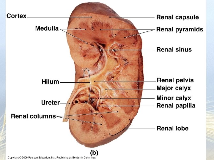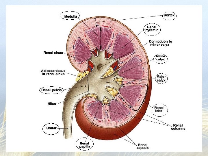 Structures • Renal sinus – hollow chamber where blood vessels, nerves, lymphatic vessels and the ureter enter and leave • Renal pelvis – superior end of the ureter expanded into a sac inside the renal sinus • Renal medulla – inner region of the kidney composed of the renal pyramids • Renal cortex – outer shell around medulla that dips into the medulla to create the renal columns • Nephrons – the functional unit of the kidney about 1 million/kidney