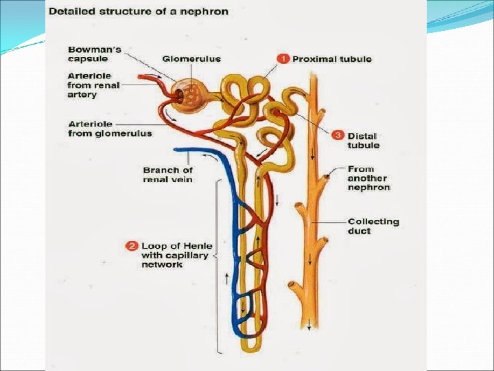 Nephron Glomerular capsule Proximal Convoluted tubule Henle’s loop Distal convuluted tubule Collecting tubules Duct of bellini