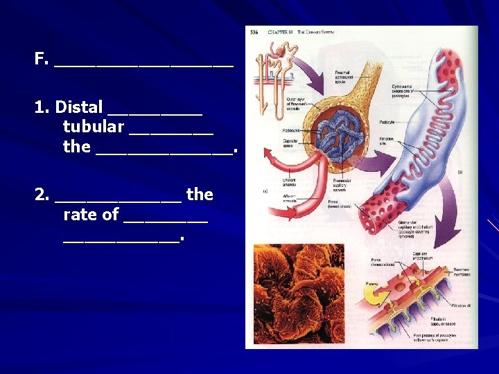 E. Blood Flow Through Nephron Blood _____ - Large -> _______ - Narrow & _____ high back pressure Efferent Blood <- Peritubular Tubulars porus & ____ pressure