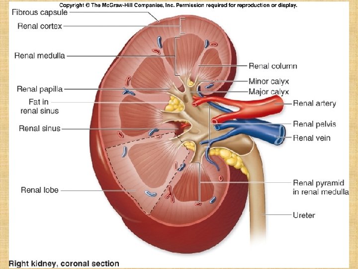 Kidney Anatomy • ~size of a large bar of soap • A kidney has 3 distinct regions – Cortex – most external region (glomeruli of nephrons found here) – Medulla – middle region (loop of Henle & collecting duct found here) – Pelvis – most internal region (urine collected here)