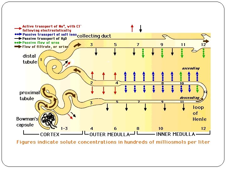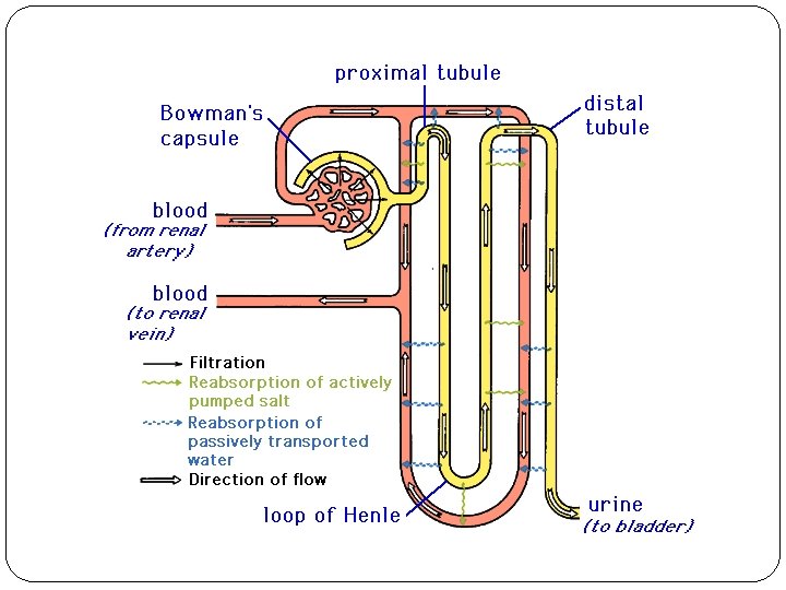 Still in the Nephron After plasma enters the proximal tubule, it passes through the coils, where usable materials and water are reclaimed. Salts, glucose, amino acids, and other useful compounds flow back through tubular cells into the blood by active transport. Osmosis and the activity of hormones assist the movement. The blood fluid then flows through the loop of Henle into the distal tubule. Once more, salts, water, and other useful materials flow back into the bloodstream. Homeostasis is achieved by this process: A selected amount of hydrogen, ammonium, sodium, chloride, and other ions maintain the delicate salt balance in the body.