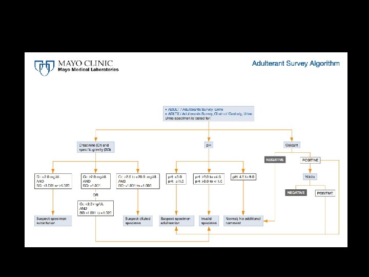 Invalid specimens “Invalid” is a laboratory result Will never be reported with a “negative” result may accompany “positive, ” “adulterated, ” or “substituted” results Reasons may include: inconsistent Cr and SG results abnormal p. H abnormal nitrite concentration presence of chromium or halogen or glutaraldehyde or oxidant or surfactant
