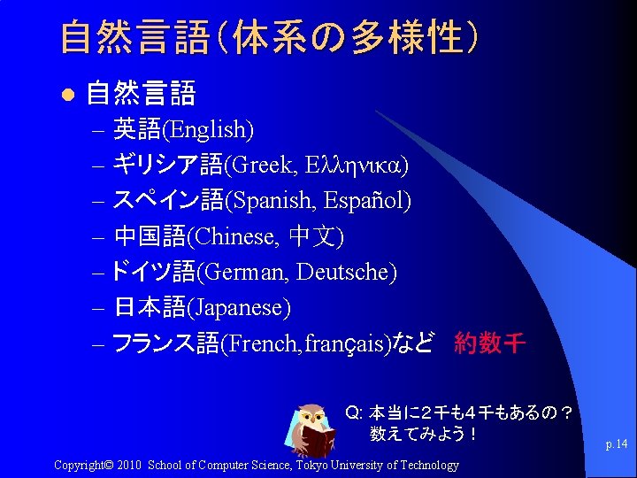 自然言語 そもそも言語とは? – 人 言語 (artificial languages) ( 形式言語 (formal languages) ) – 自然言語 (natural languages) p. 10 Copyright© 2010 School of Computer Science, Tokyo University of Technology