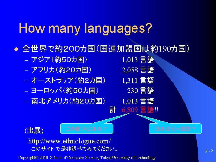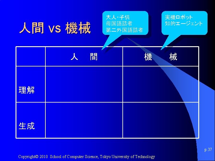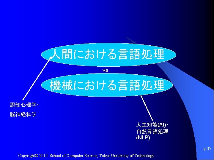 人間における言語処理 vs 機械における言語処理 p. 34 Copyright© 2010 School of Computer Science, Tokyo University of Technology