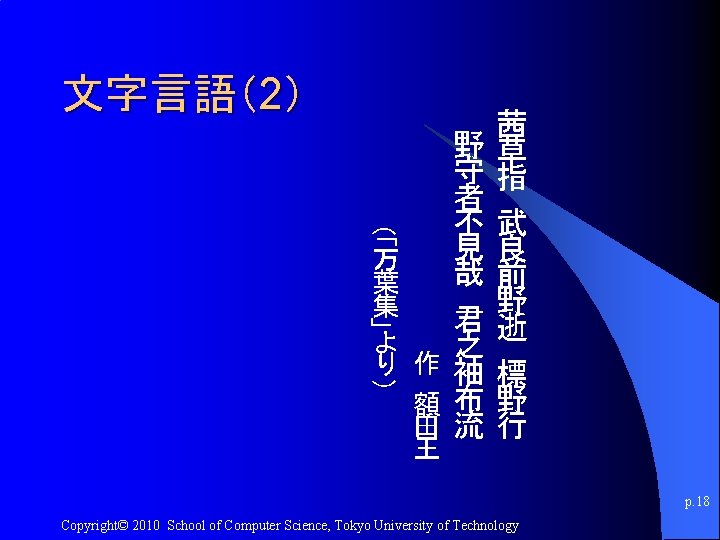 文字言語(4) Es war einmal ein König in Thule Gar treu bis an das Grab, Dem sterbend seine Buhle Einen goldnen Becher gab. (「Faust」より) p. 20 Copyright© 2010 School of Computer Science, Tokyo University of Technology