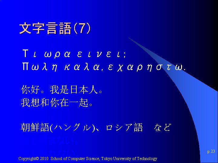 文字言語(6) l Δεν ελπίζω τίποτα. Δε φοβάμαι τίποτα. Είμαι λέφτερος. ( I hope for nothing. I fear nothing. I am free. ) 出典: http: //en. wikipedia. org/wiki/Nikos_Kazantzakis p. 22 Copyright© 2010 School of Computer Science, Tokyo University of Technology