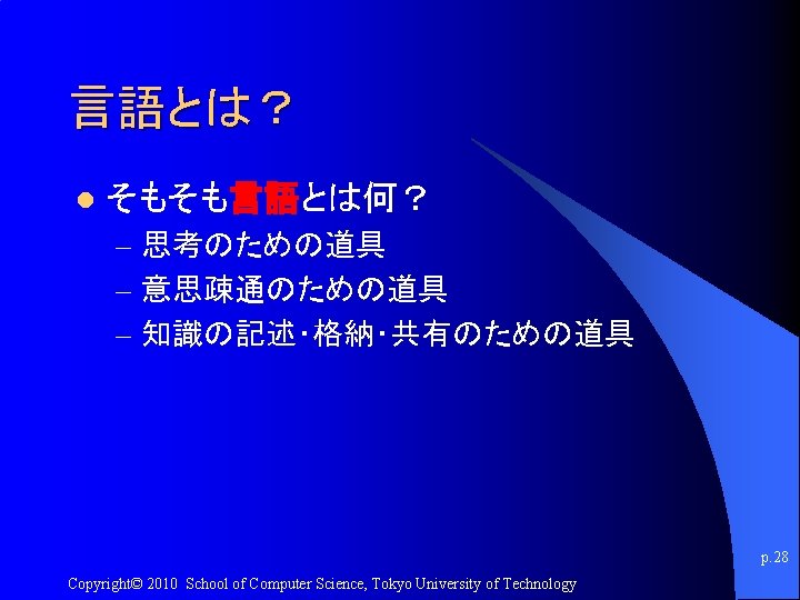処理対象 l 以下は主として、文字言語とする。 (「テキスト処理」ということ。) p. 27 Copyright© 2010 School of Computer Science, Tokyo University of Technology