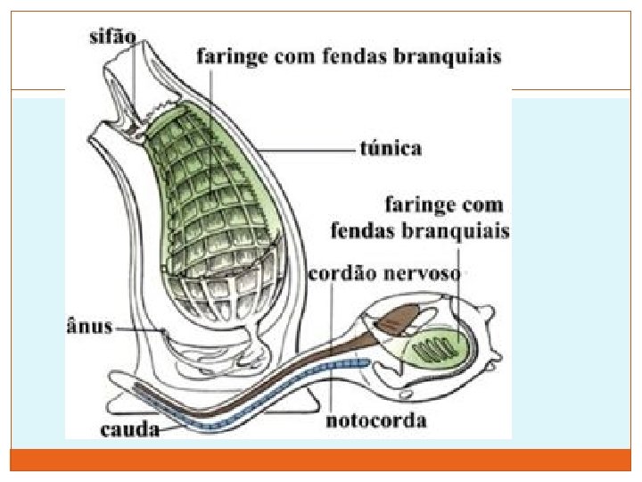 (Urocordados ou Tunicata) �São animais marinhos; �Adultos fixos – larva vida livre; �Apresentam notocorda restrita a região caudal, portanto a corda dorsal está ocupando a cauda; �A cauda, a notocorda e o tubo nervoso dorsal regridem na fase adulta; �Coração alterna o sentido da corrente sangüínea; �Não há sistema excretor;