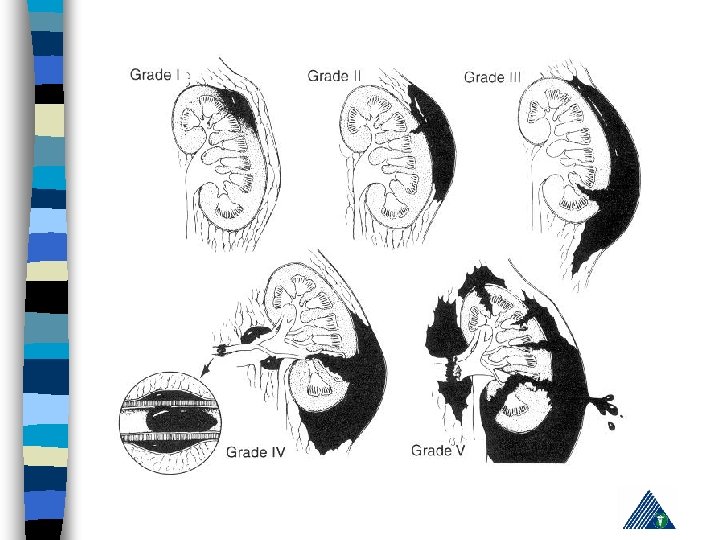 American Association for the Surgery of Trauma Organ Injury Severity Scale for the Kidney Grade Tip Tanım 1 kontüzyon Mikroskobik ya da gross hematuri, ürolojik incelemeler normal hematom Sub. Kapsuler, genişlemeyen parankimal hasar yok hematom Genişlemeyen perirenal hematom , renal retroperitona sınırlı laserasyon <1 -cm derinlikte parenkimal korteks hasarı, üriner ekstravazasyon yok 3 laserasyon >1 -cm derinlikte parenkimal korteks hasarı, üriner ekstravazasyon yok 4 laserasyon Medulla ve toplayıcı sisteme ulaşan parenkim hasarı vasküler Renal arter ve vende hemoraji içeren hasar laserasyon Tamamen parçalanmış Böbrek vasküler Renal hilusun ayrılması 2 5