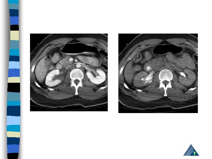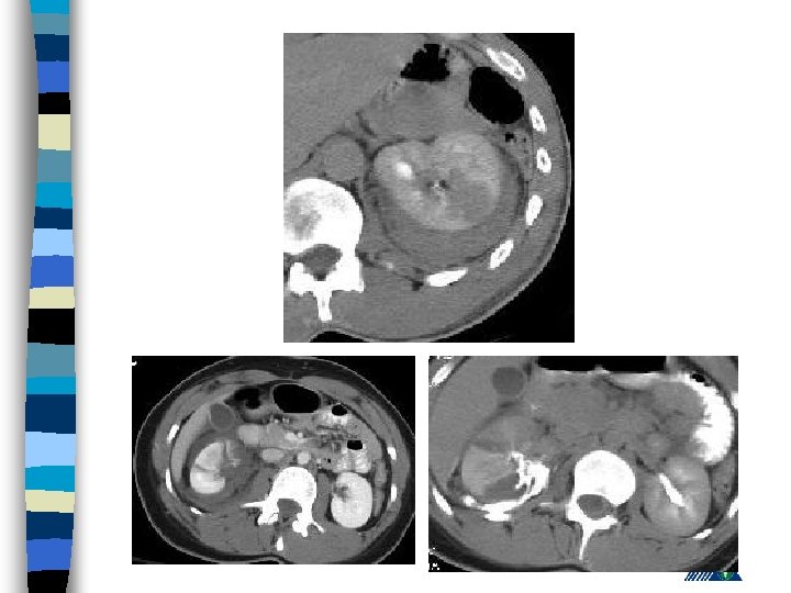 Radiologic Imaging n n n KUB (loss of psoas or renal contour) IVU (delayed renal function, nonhomogenous collecting system) USG (lumbar hematoma and urinoma lokalizasyonu) Computerized Tomography Renal angiography
