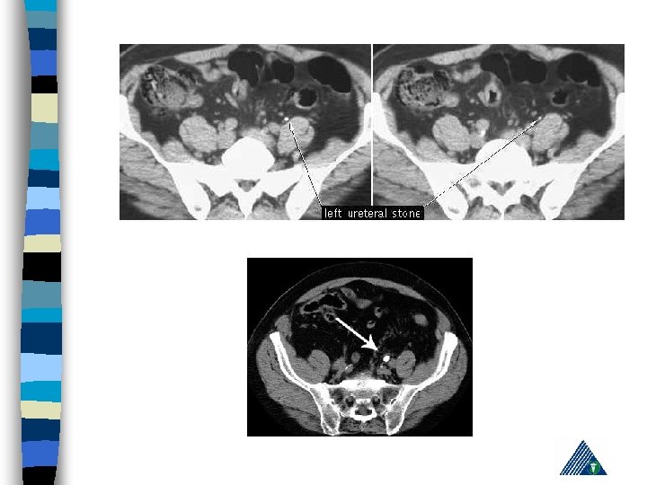 R: Appendicitis - Cholelithiasis n urinalysis: hematuria n KUB n IVP n Computerized Tomography n Pain management, hydration, hot bath n Treatment of the underlying cause n