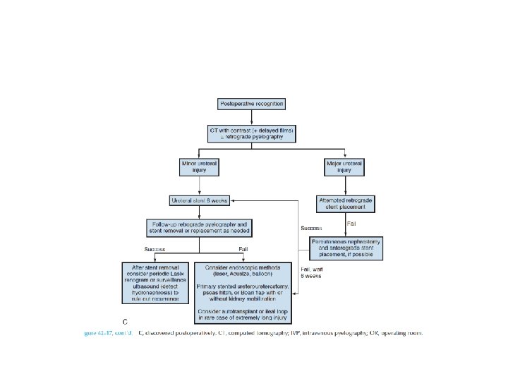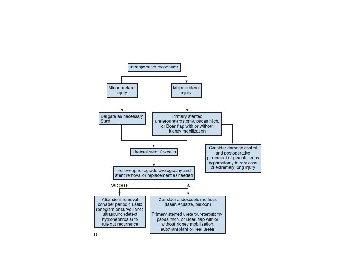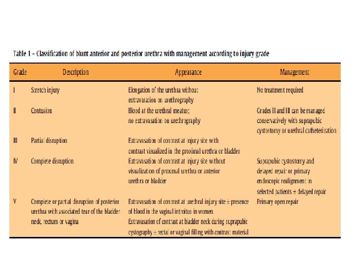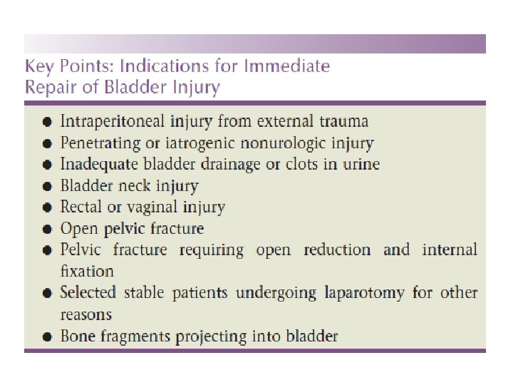 Management (intraperitoneal bladder rupture) • All penetrating and intraperitoneal injuries should be managed with immediate open repair. • Catheter removal 1 week after cystogram.
