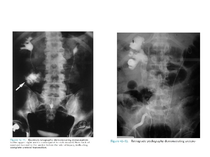 Imaging of trauma patient with hematuria • CT preferred – With contrast – With “delayed” films (mandatory) – Why not get CT cystogram too? • Standard intravenous pyelogram (IVP): Forget it • “One Shot” intraoperative IVP – 2 cc/kg intravenous contrast – Single film at 10 minutes