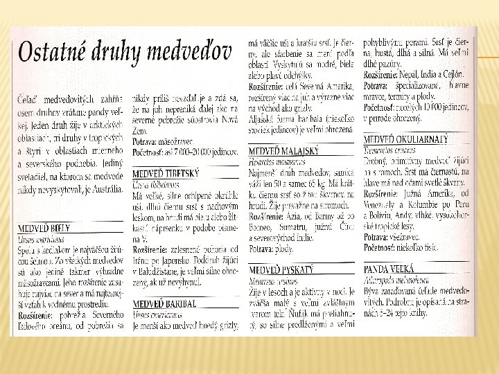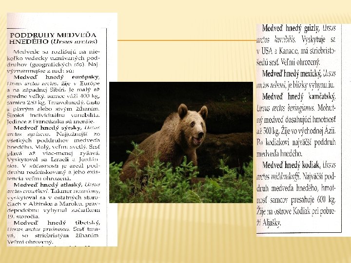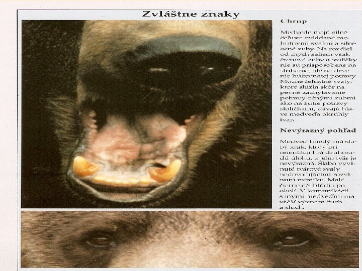 Potrava Hoci patrí medzi šelmy, medveď nie je dobrým lovcom. Postupne sa stal všežravcom, pričom 85 -90% jeho potravy tvorí rastlinná zložka. Na jar je to tráva, byliny, ale aj uhynuté zvieratá. V lete aj na jeseň je medvedí jedálniček pestrejší. Obsahuje čučoriedky, maliny a iné ovocie, bukvice, žalude, mravčie a osie larvy. Niektoré jedince navštevujú včelíny, polia, skládky odpadu či napádajú dobytok. Jeseň Medvede sa v tomto období pripravujú na zimu. Na zimný spánok sa väčšina z nich ukladá od začiatku decembra a trvá do konca februára. Potrebujú si vytvoriť dostatočné tukové zásoby, aby prežili toto obdobie bez prijímania potravy. Na toto sú uspôsobené biochemickým a fyziologickým štádiom: tzv. "hyperphagia" (zvýšený príjem potravy). Vtedy sa intenzívne krmia a aktívne môžu byť aj počas dňa. Keďže reprodukčná úspešnosť u medveďov priamo súvisí so zväčšovaním objemu na jeseň, dostupnosť vysoko energetickej potravy má dôležitý vplyv pre medveďov ako pre populáciu rovnako aj pre jedincov. Náš výskum potvrdil dôležitú úlohu lesných plodov: dužinaté plody (čučoriedky, jablká, maliny, brusnice, jarabina, šípky) sú bohaté na uhľohydráty a tvrdé plody (bukvice, žalude) sú bohaté na tuk. Spolu tvoria približne 30 -40% potravy počas celého roka.