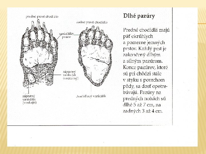 Ako sa vyhnúť problémom s medveďmi Ak nechcete natrafiť na medveďa, buďte ostražitý v lese a v blízkosti lesa. Všímajte si stopy alebo iné znaky prítomnosti medveďa – ak sú čerstvé, zvýšte vašu pozornosť. Buďte obzvlášť pozorní v hustom poraste, na miestach s hojnosťou lesných plodov, pri zdochlinách, zlej viditeľnosti alebo počuteľnosti, aj ak idete proti vetru. Dávajte si pozor najmä ráno, večer a v noci, keď sú medvede aktívnejšie, ale aj cez deň v hustom poraste alebo v okolí zdrojov potravy. Stopy majú päť prstov a pazúrov na každej labe. Zadná stopa je dlhšia, u dospelého medveďa je približne taká veľká ako mužská. Podľa veľkosti stôp je tiež možné odhadnúť veľkosť jedinca (viď dole).
