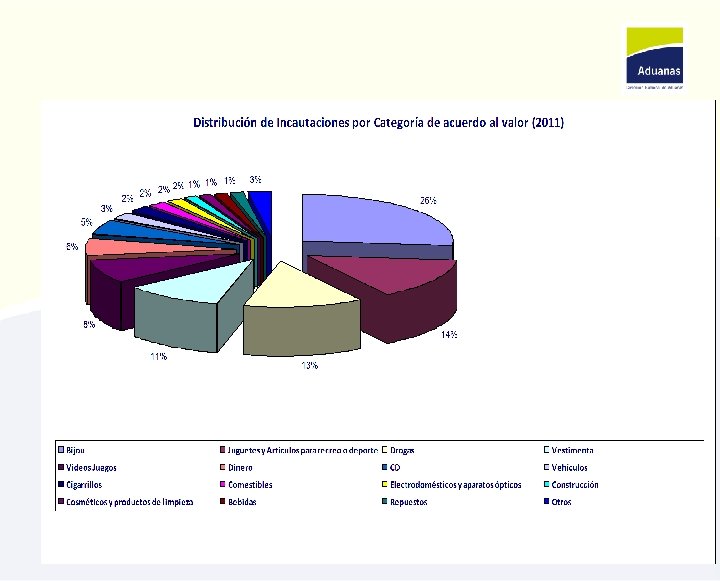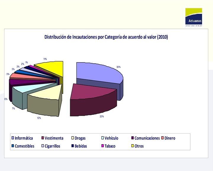 INCAUTACIONES 2010 - 2011 • Combate a las organizaciones delictivas Mediante un equipo especial de inteligencia apostamos a desarticular el accionar de organizaciones dedicadas al contrabando. • Especial atención al tráfico de drogas Equipamos nuestros puestos fronterizos con tecnologías que permitan un control menos intrusivo y más eficaz para detectar el tráfico de sustancias • Valores no declarados En consonancia con la lucha contra el lavado de activos • Mercaderías peligro En consonancia con los objetivos de proteger a nuestra sociedad.